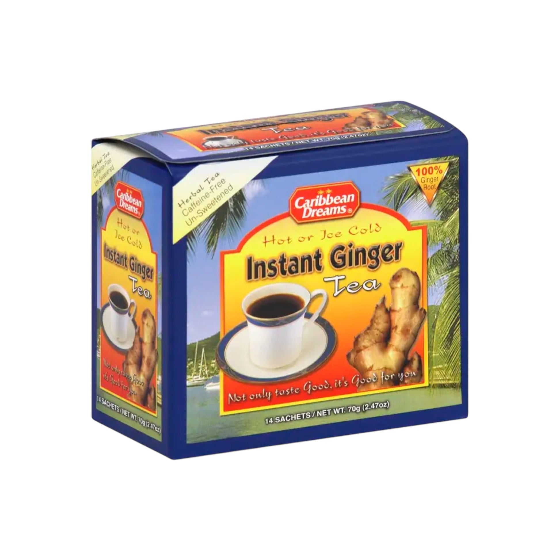 Caribbean Dreams Instant Ginger Tea Unsweetened. All of our Herbal Teas are Caffeine Free, rich in Antioxidants and Vitamins, and are truly delicious when served traditionally as Hot Tea or as Iced Tea. Our Herbal Teas are simply fresh herbs individually or blended, whose medicinal properties have largely been released into the water. Not only good, it’s good for you. Try a Cup Today!